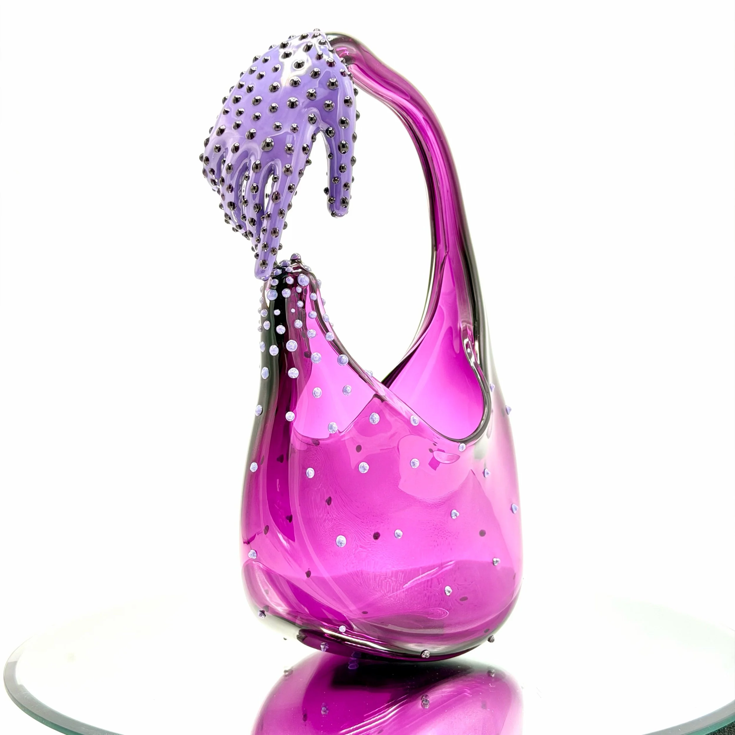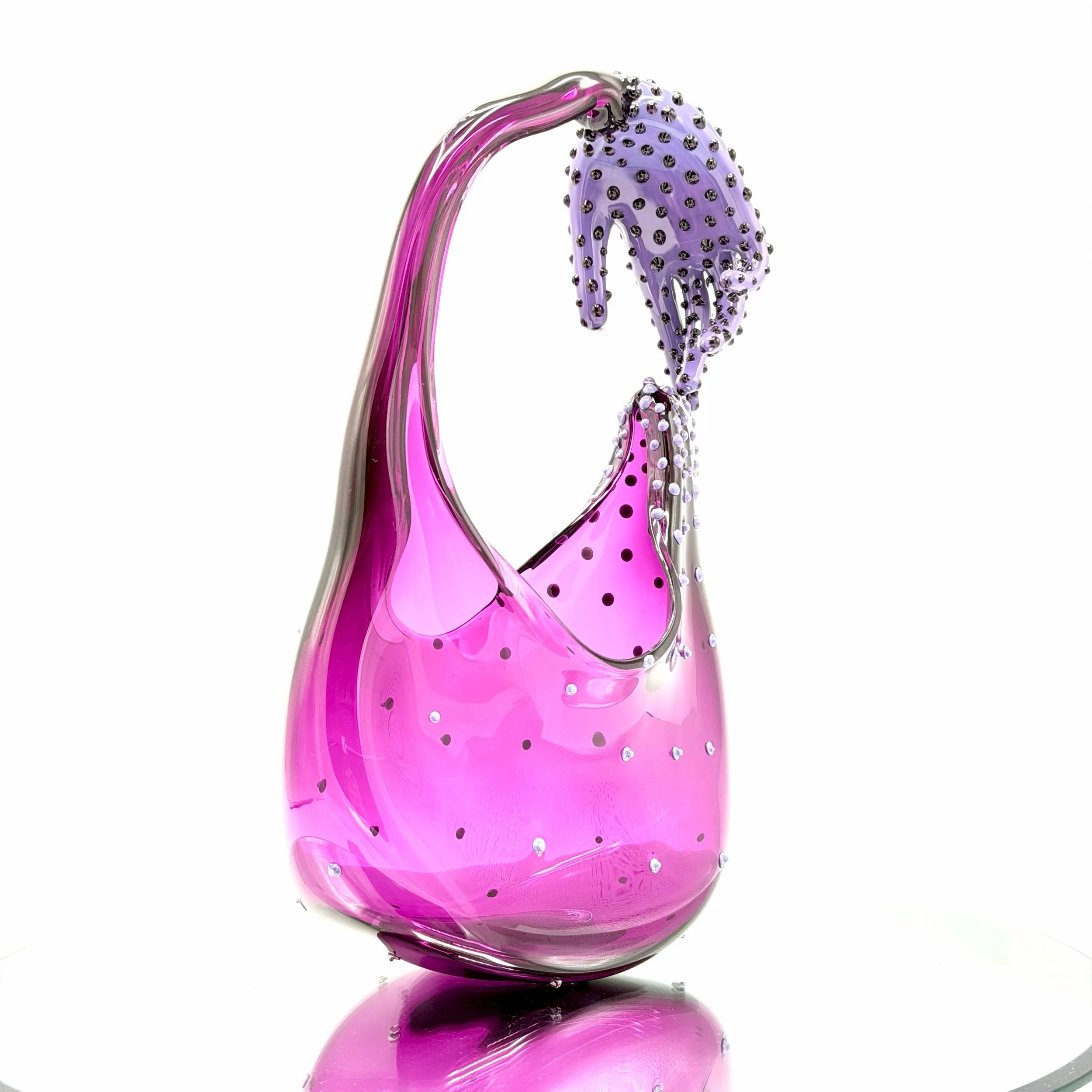 Heliotrope bag with lavender polkadots, densely clustered by the finger dissipating away into the bag. A lavender hand gently hovers over the infected nub. It is enrobed in transparent, purple dots.